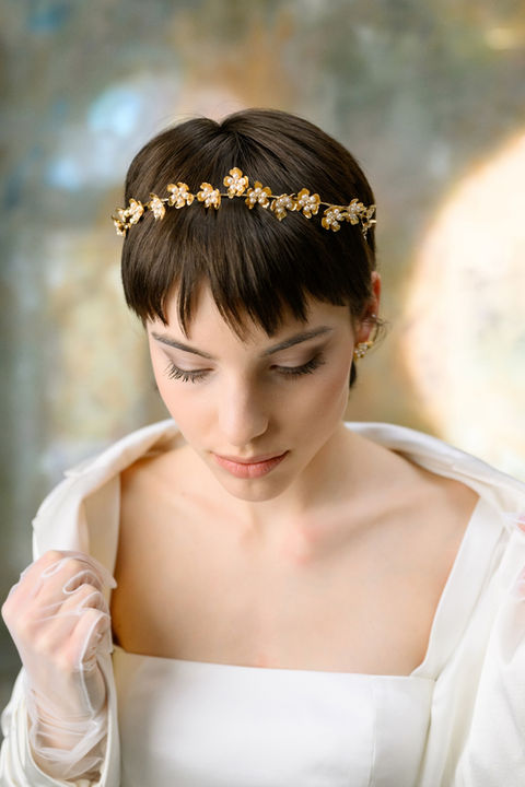 Elevate your bridal allure with our delicate and lightweight romantic tiara. Adorned with gilded flowers and gleaming pearls, this tiara embodies timeless romance and elegance. Its flexible base ensures effortless wear, whether gracing the front as a regal centerpiece or accentuating a hairstyle from the back. The gilded petals delicately capture and reflect light, creating a mesmerizing aura. Choose from our exquisite gold or silver-plated versions to add a touch of enchantment to your bridal ensemble.