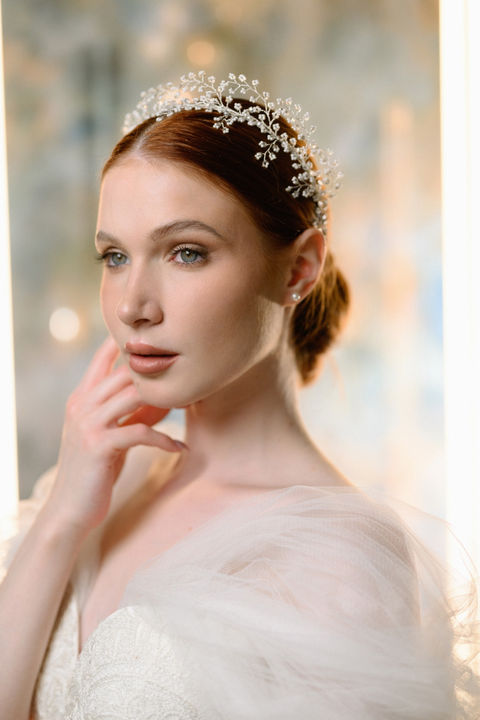 A delicately crafted bridal headpiece featuring hand-woven myrtle branches made of tiny pearls and crystals, set on a silver-treated base for an elegant fusion of tradition and romance.