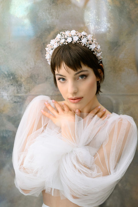 Introducing a timeless sparkling flower crown that remains forever in bloom, offering both glamour and a natural allure. Designed for brides who desire the perfect blend of flowers and crystals in their hair. Bespoke options in colours are available.