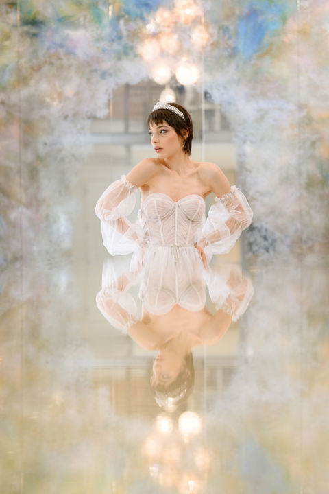 An opulent crystal tiara befitting a fairytale. Inspired by the enchanting shimmer of water, we crafted it with the delicate glow of clear crystal pearls intertwined with the noble radiance of finely cut Swarovski crystals on a silver-plated base. Offering a unique appearance, it suits brides seeking a hint of magic in their classic style.
